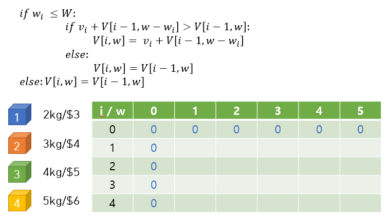 if i==0 or w==0: # 0번째 행/열은 0으로 세팅