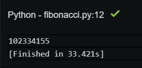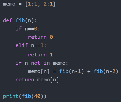 아래는 DP를 적용한 피보나치 함수와 fib(40) 을 실행했을 때의 실행 시간 차이를 보여주는 것이다. 'memo' 라는 dict를 만드는데 메모리 공간을 소비하는 대신, 속도가 비약적으로 빨라지는 것을 알 수 있다.