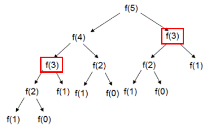 fib(5) 를 호출했다고 생각해보면 오른쪽 그림과 같이 재귀함수가 호출된다. 근데 빨간색으로 표시한 부분을 보면 왼쪽에서 이미 f(3) 을 한번 호출했는데, 오른쪽에서도 또 호출하고 있다. DP의 아이디어는 계산하는 값들을 어디다 저장해뒀다가, 저런 식으로 중복되는 계산이 나오면 저장해뒀던 값을 갖다 쓰자는 것이다. 그림에서 f(3) 의 값이 저장되어 있는 상태에서 f(3) 이 호출되면 그 값을 갖다 쓰도록 만들면, 오른쪽 트리의 f(3) 아래쪽 부분은 계산할 필요가 없게 된다.