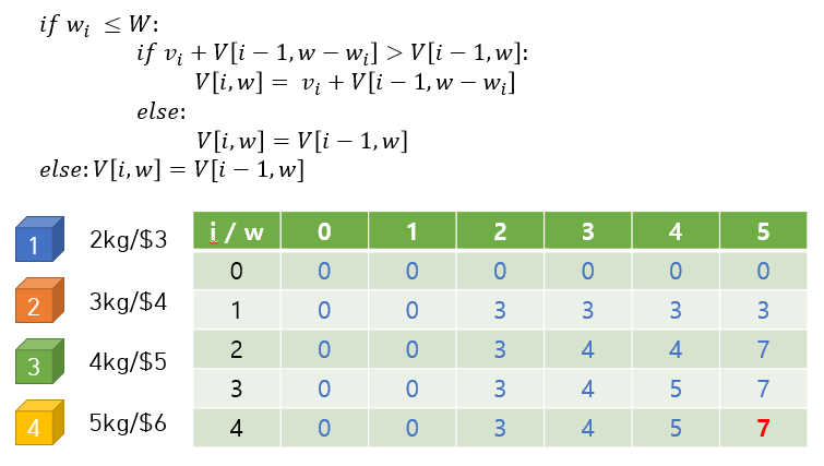 K[i][w] = max(val[i-1]+K[i-1][w-wt[i-1]], K[i-1][w]) # max 함수 사용하여 큰 것 선택