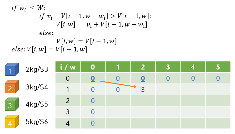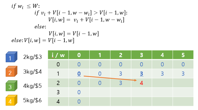 i=2인 경우를 보면, w=2일때는 현재 보고있는 2번 보석 (3kg) 을 넣을 수 없으므로 바로 윗칸의 3을 가져온다 (1번 보석을 넣는다는 뜻). w=3이 되면 2번 보석을 넣을 수 있게 되는데, 1번 보석을 넣었을 때 (바로 윗칸) 랑 2번 보석을 넣을만큼의 공간을 확보하고 2번 보석을 넣었을 때 (즉, 2번 보석의 가치 + V[1, 0]) 를 비교해서 더 가치가 높은 쪽을 선택한다. 그래서 4가 들어간다.
