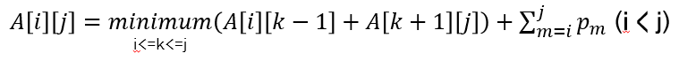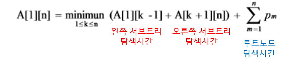 그리고 k개의 BST 중 하나는 반드시 최적이다. 서브트리들은 이미 최적이라고 했기 때문에 루트노드를 k번 바꿔보고 그 중 최적의 값을 구하면 그게 전체에 대한 최적의 값이다. 이를 종합하면 아래와 같은 식이 나온다.