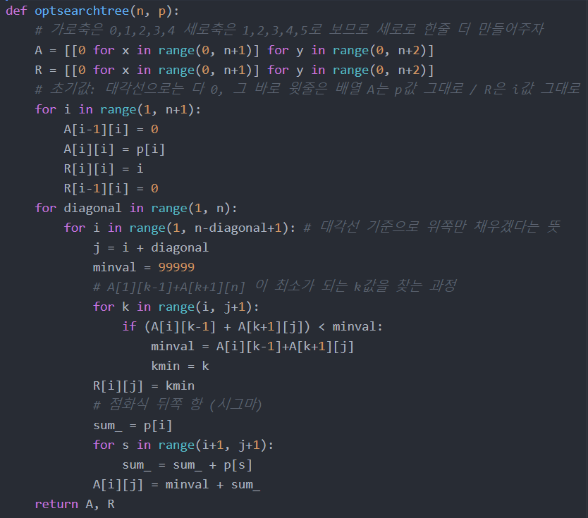 i=j인 경우는 하나의 단어, 그러니까 노드 하나뿐인 BST가 되므로 A 배열에는 그 단어의 검색 빈도가 그대로 들어가고 R 배열에는 그 단어의 번호가 들어간다.