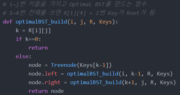 위에서 만든 R 리스트를 이용해서 최적 BST를 만드는 함수다. 아까 R 배열에 대해서 설명할 때 언급했듯 재귀적으로 동작하므로 i, j를 인자로 받아야 한다. 예시처럼 key가 4개라면, 처음 호출할 때는 (1, 4, R, Keys) 로 호출하면 된다. Keys는 말 그대로 key 단어들이 들어가있는 리스트다.