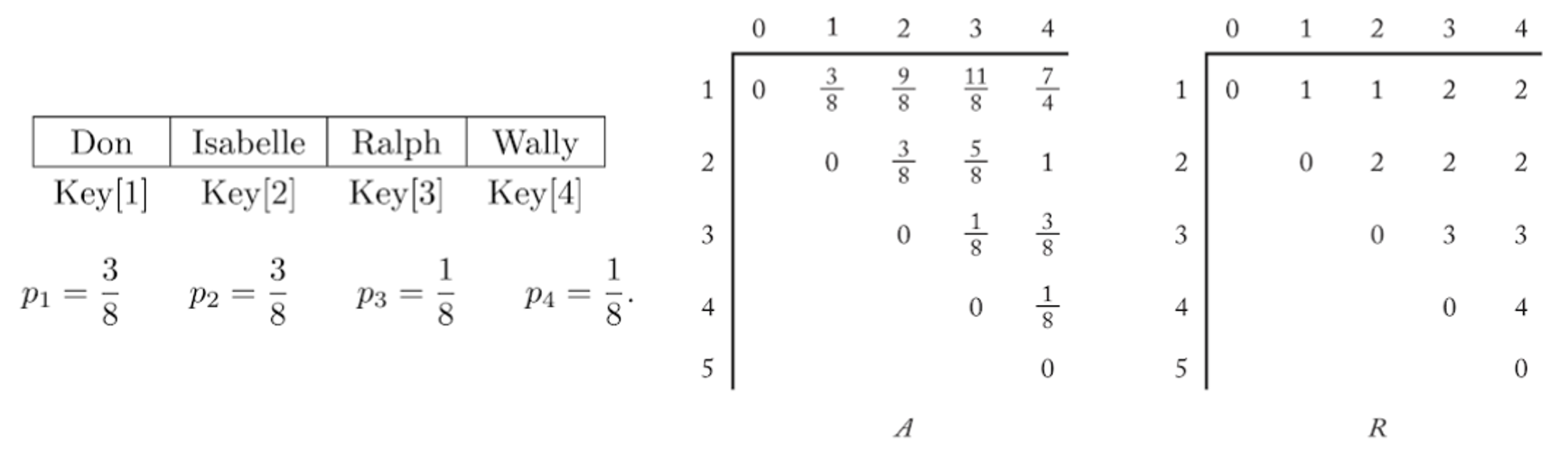 예시를 보면서 이해해보자. 4개의 key (단어) 들이 있고 각각의 검색 빈도는 왼쪽과 같다. A 배열이든 R 배열이든 'i번째부터 j번째 key를 이용해서 만든 최적 BST' 에 대한 내용을 담고 있으므로, i<=j인 경우만 생각하면 된다. 그러므로 대각선을 기준으로 왼쪽 아래에는 값을 넣을 필요가 없고, 대각선 칸은 0으로 모두 채운다.
