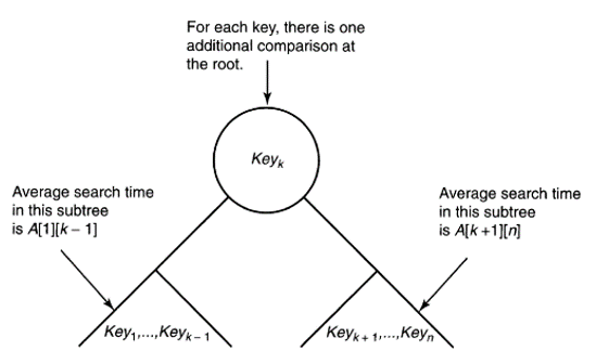 먼저 i번째 key부터 j번째 key까지로 최적 BST를 만들었을 때의 평균 검색 시간, 즉 최적값을 A[i][j] 라고 정의하자. 그러면 서브트리의 평균 검색 시간은 루트노드가 k번째 key일 때 왼쪽, 오른쪽 각각 A[1][k-1], A[k+1][n] 이다 (서브트리는 각각 최적 BST이므로). 그리고 루트노드는 깊이가 1이므로